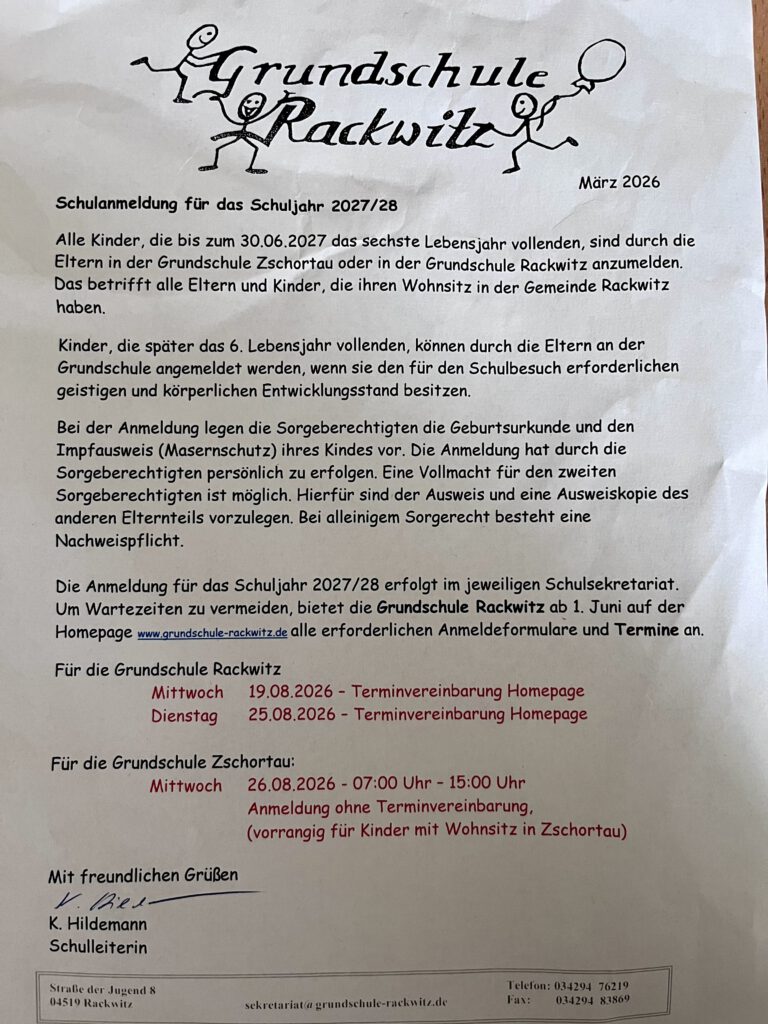 Sollte die Anmeldung an diesen Tagen nicht möglich sein, dann vereinbaren Sie bitte per Mail (sekretariat@grundschule-zschortau.de) einen anderen Termin.